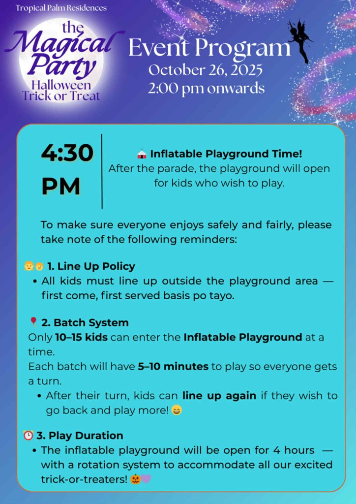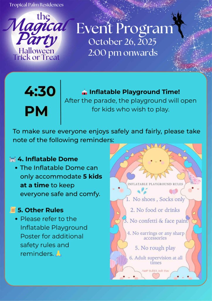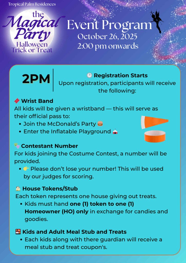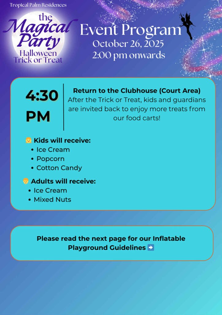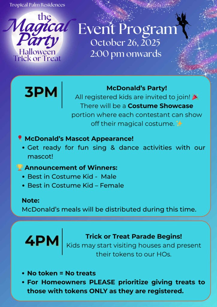 We can’t wait to see everyone in their most creative costumes and biggest smiles as we celebrate another memorable Halloween at Tropical Palm Residences. Let’s make this year’s Trick or Treat 2025 a safe, fun, and magical experience for the whole community.